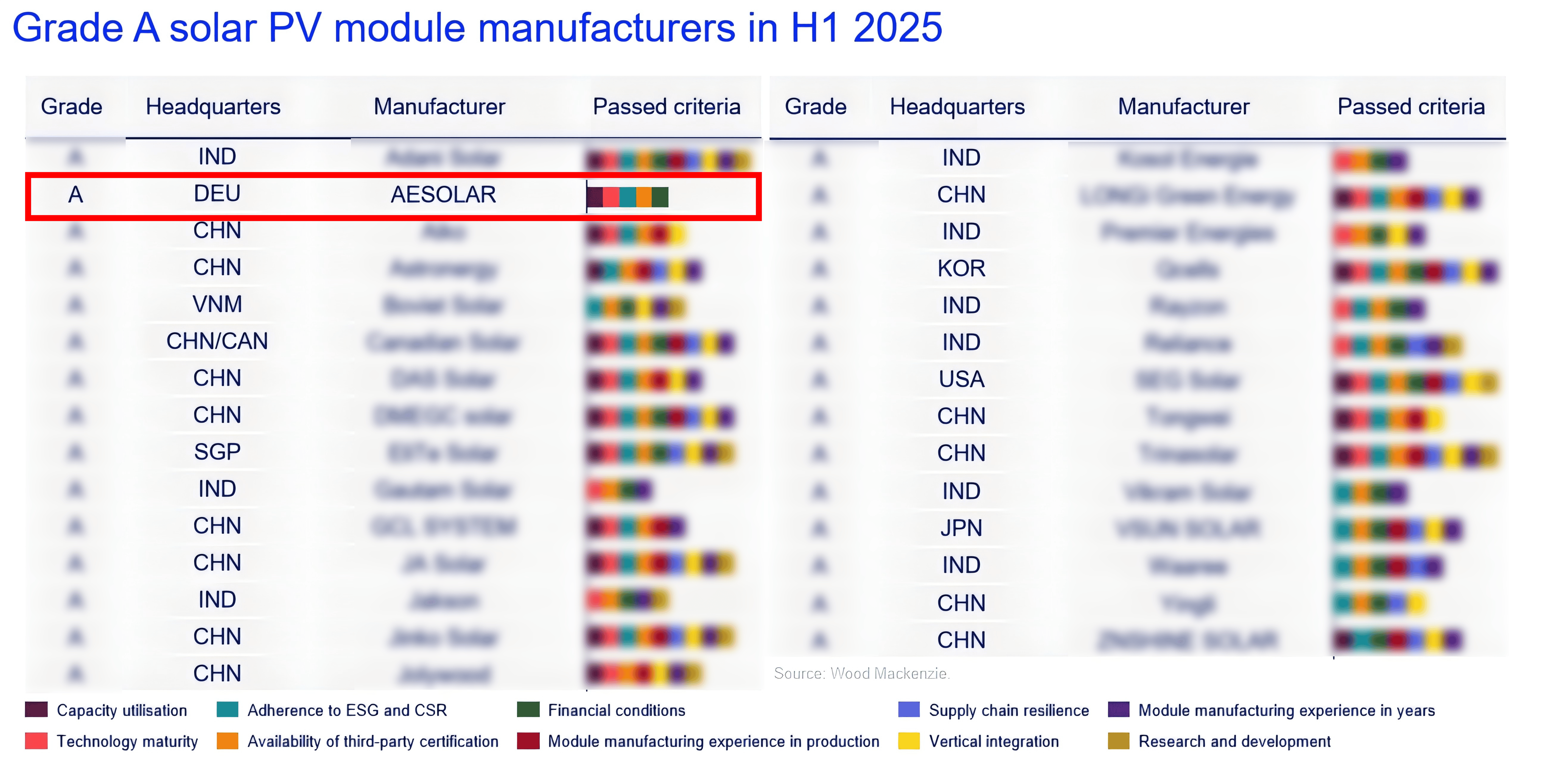 AESOLAR Named as the Sole European Grade A Solar Module Manufacturer by Wood Mackenzie
