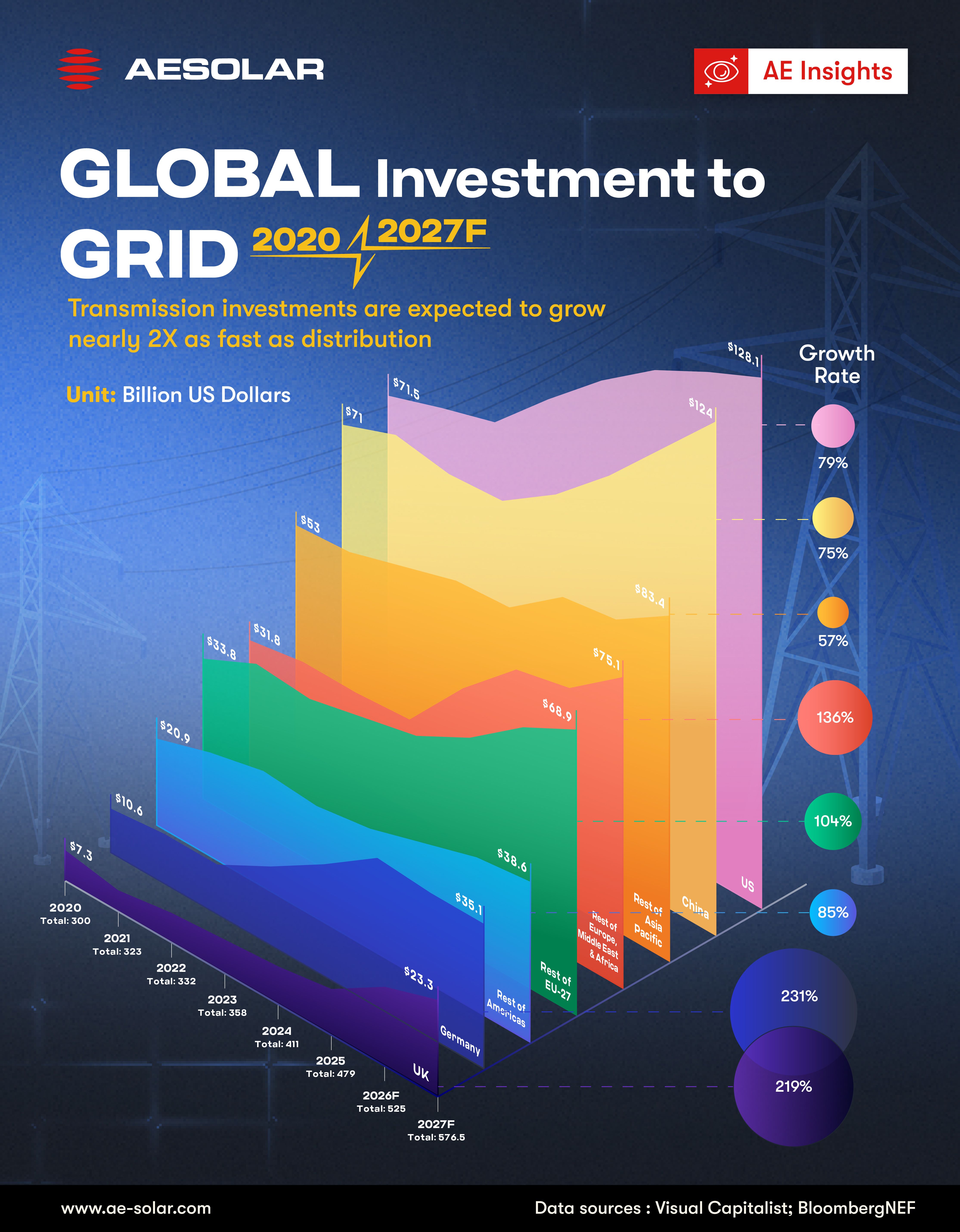 The latest data shows a decisive acceleration in global grid investment between 2020 and 2027F. Total global investment rises from USD 300 billion in 2020 to a projected USD 576.5 billion by 2027, with a particularly sharp increase after 2023. By 2025 alone, global grid investment is projected to reach USD 479 billion, reflecting a structural shift rather than a cyclical fluctuation.
