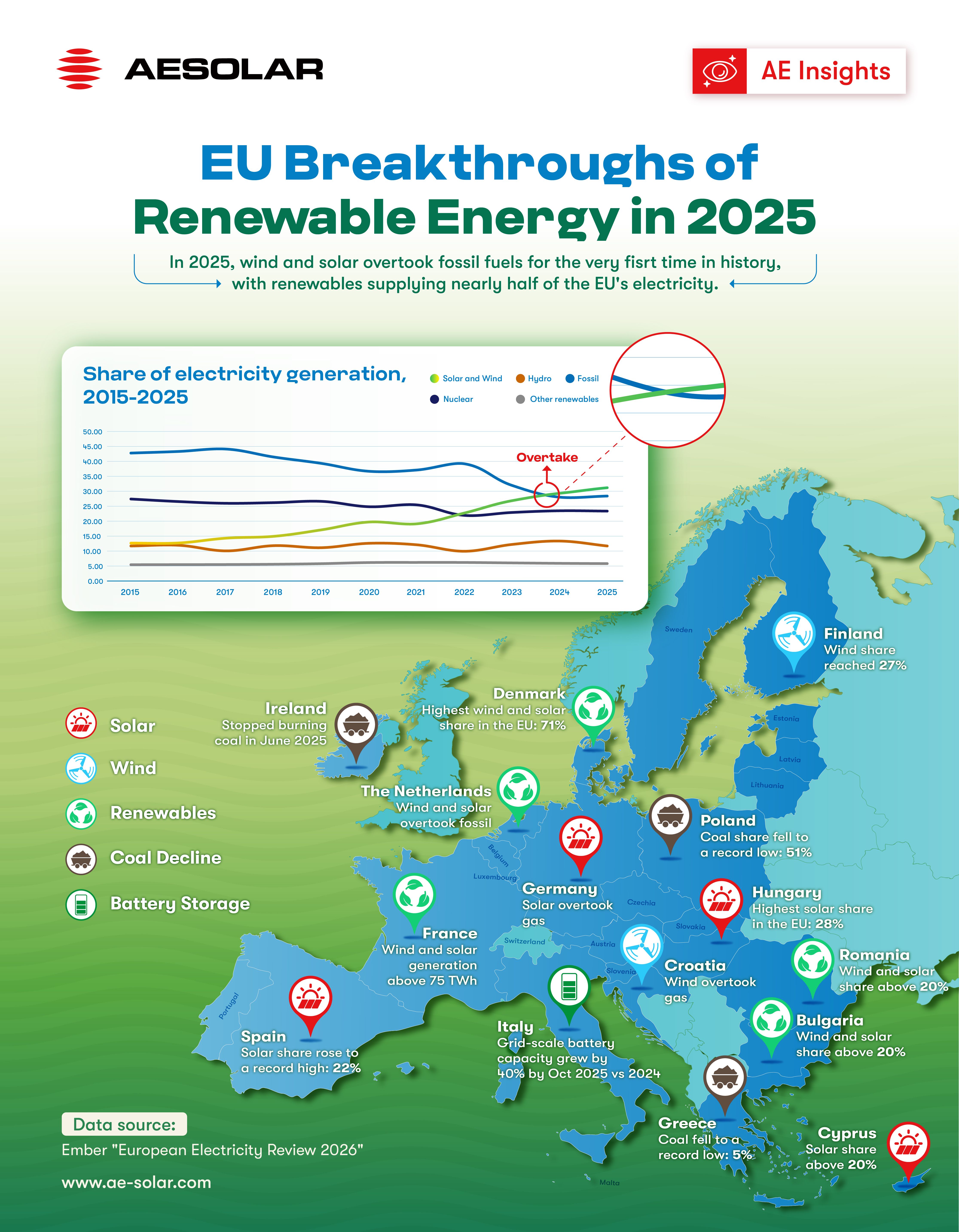 Europe’s energy transition is accelerating. Wind and solar power have moved beyond niche technologies and are now central pillars of the EU electricity system. Continued investment in grids, storage, and advanced solar solutions will be essential to sustain this momentum. As the deployment of solar power expands across new sectors and applications, AESOLAR continue to support the global transition with innovative photovoltaic solutions designed for a wide range of environments—from traditional power plants to emerging niche markets.