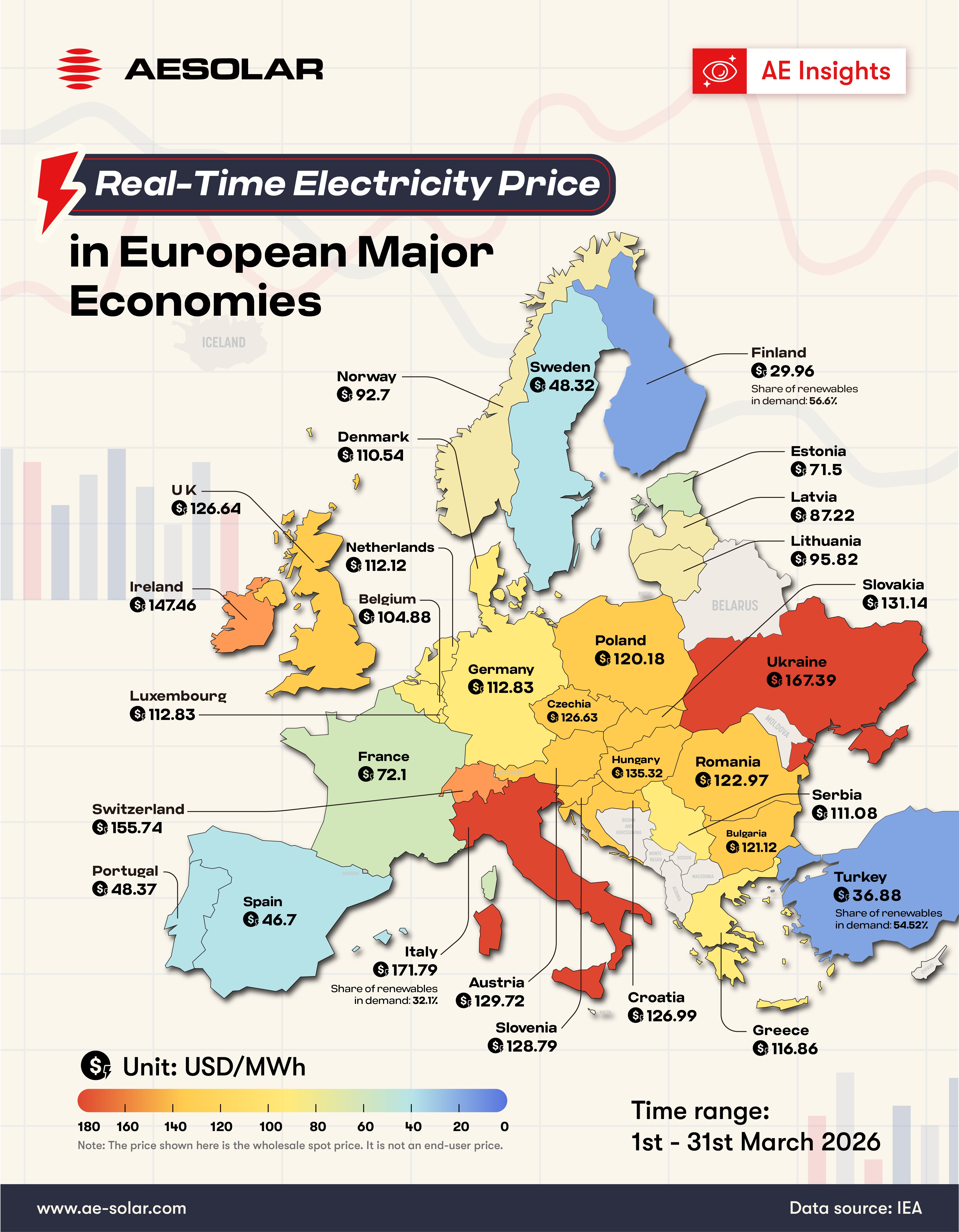 In contrast, markets with higher renewable penetration demonstrated greater resilience. Southern Europe offers a clear example—Spain (46.7 USD/MWh) and Portugal (48.37 USD/MWh) recorded some of the lowest electricity prices in Europe during the same period. This was supported by strong solar generation, with both countries setting new solar output records in March, effectively suppressing daytime prices.