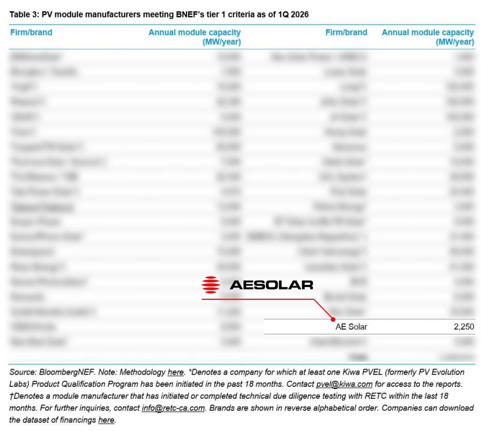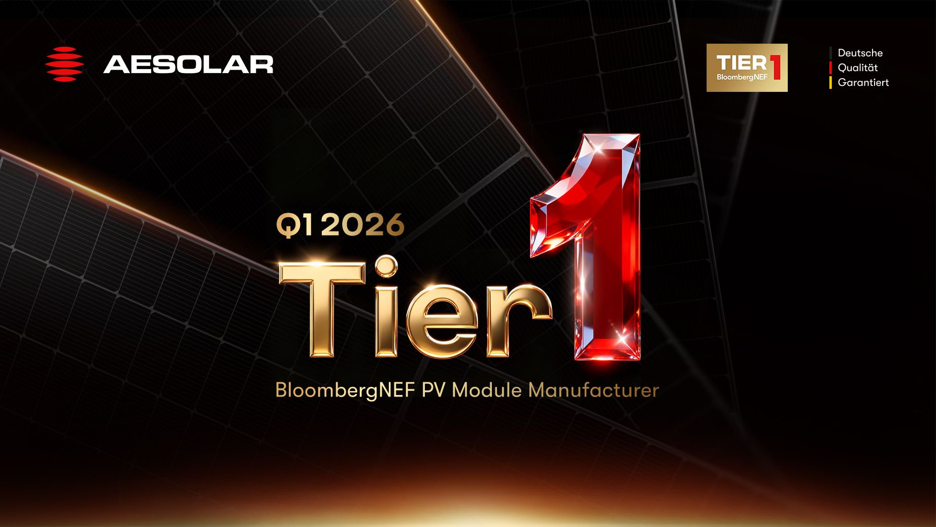 Gersthofen, Germany — AESOLAR has once again been named a Tier 1 PV Module Manufacturer in the BloombergNEF 1Q 2026 Global PV Market Outlook, marking AESOLAR's fifth consecutive year of appearance on the prestigious list since its first inclusion in 2021 — and the 17th time of recognition.